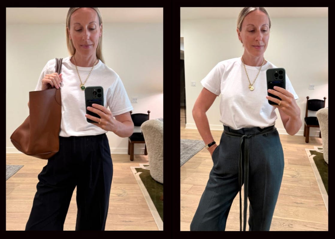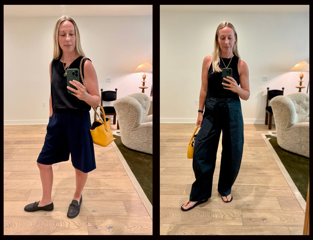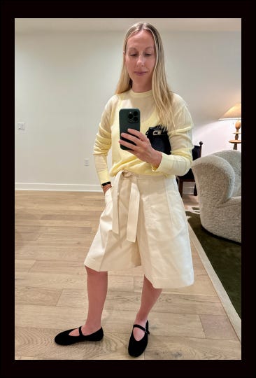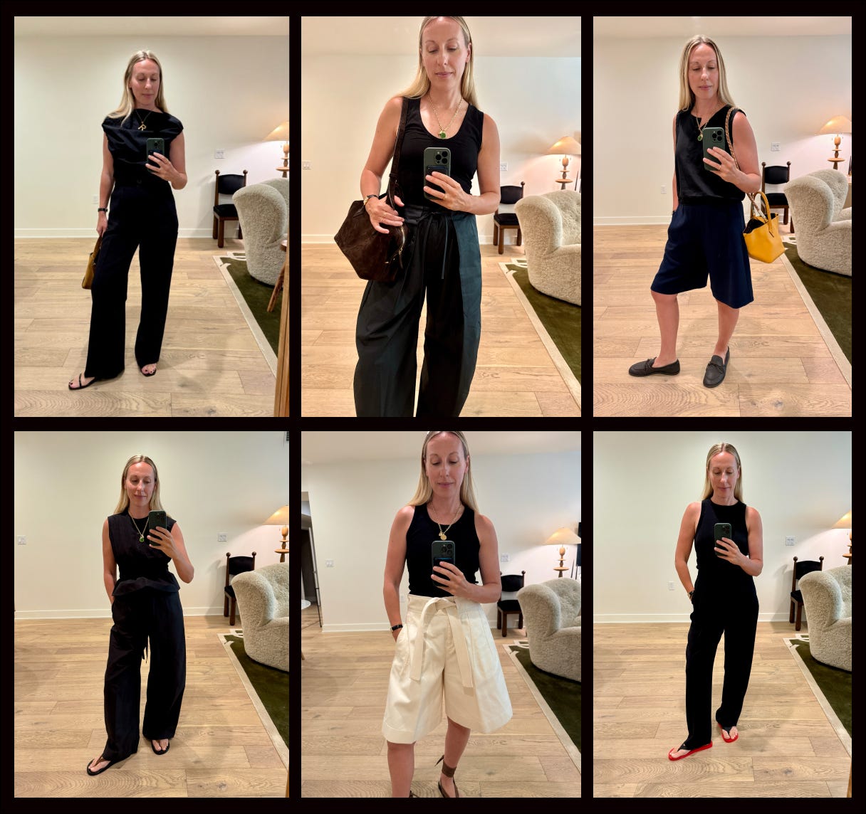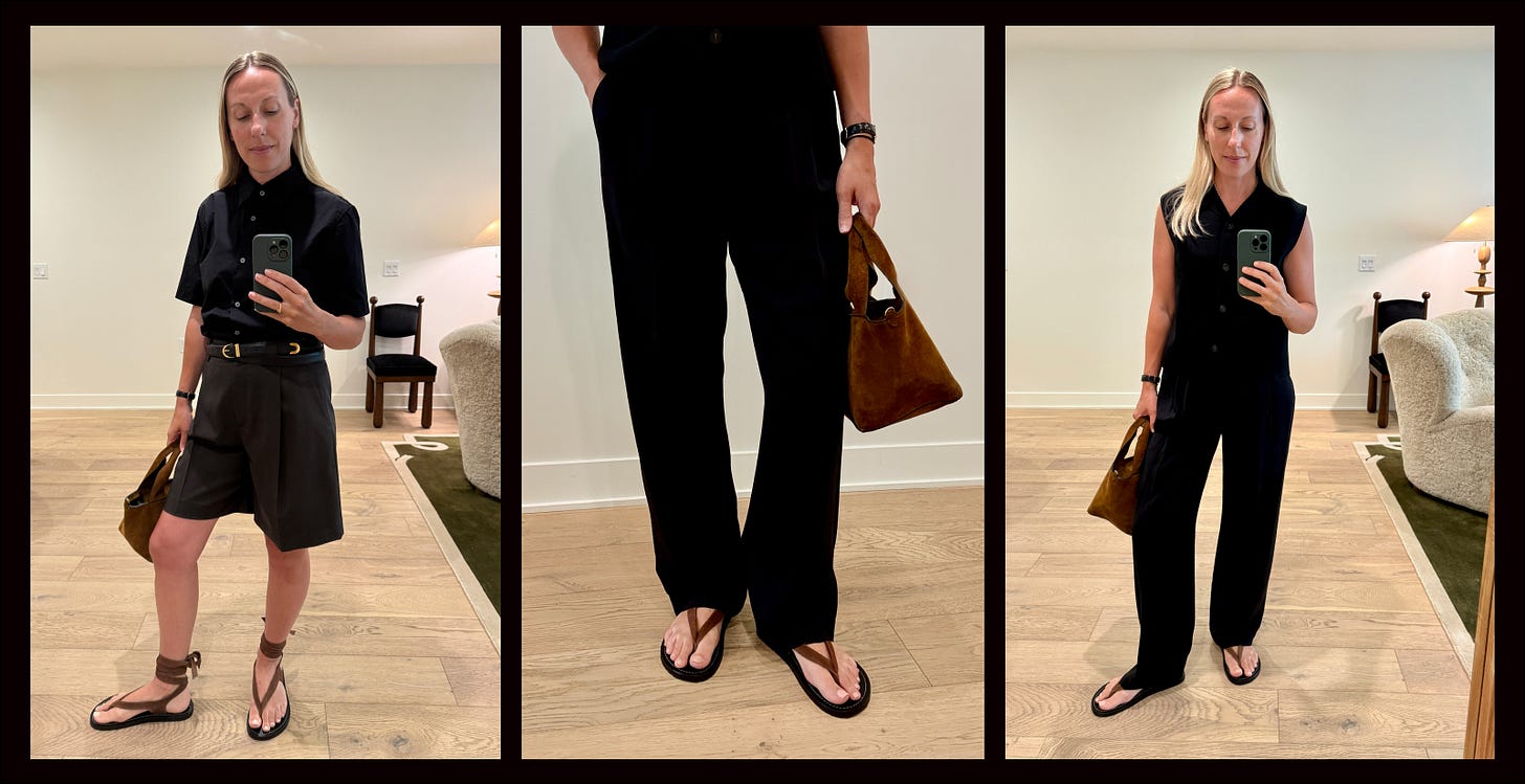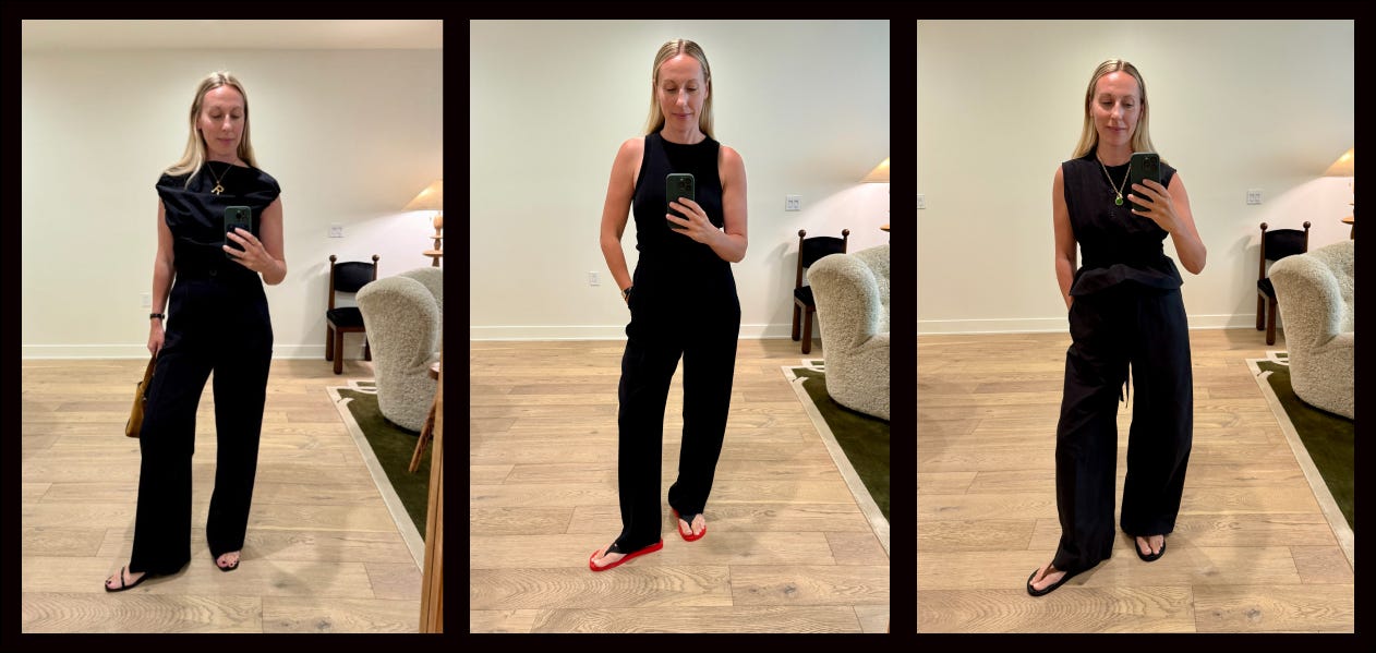 Obviously from above (and this post) black is my color of choice and I’m always looking to update how I’m wearing it. Still leaning on the Toteme gathered top and Attersee pants but also now incorporating this Jenni Kayne top (seamed at the waist to cinch in and be paired perfectly with the Matteau foldover pant), and not so proud of these amazon red The Row knocks off flip flops. But here we are.